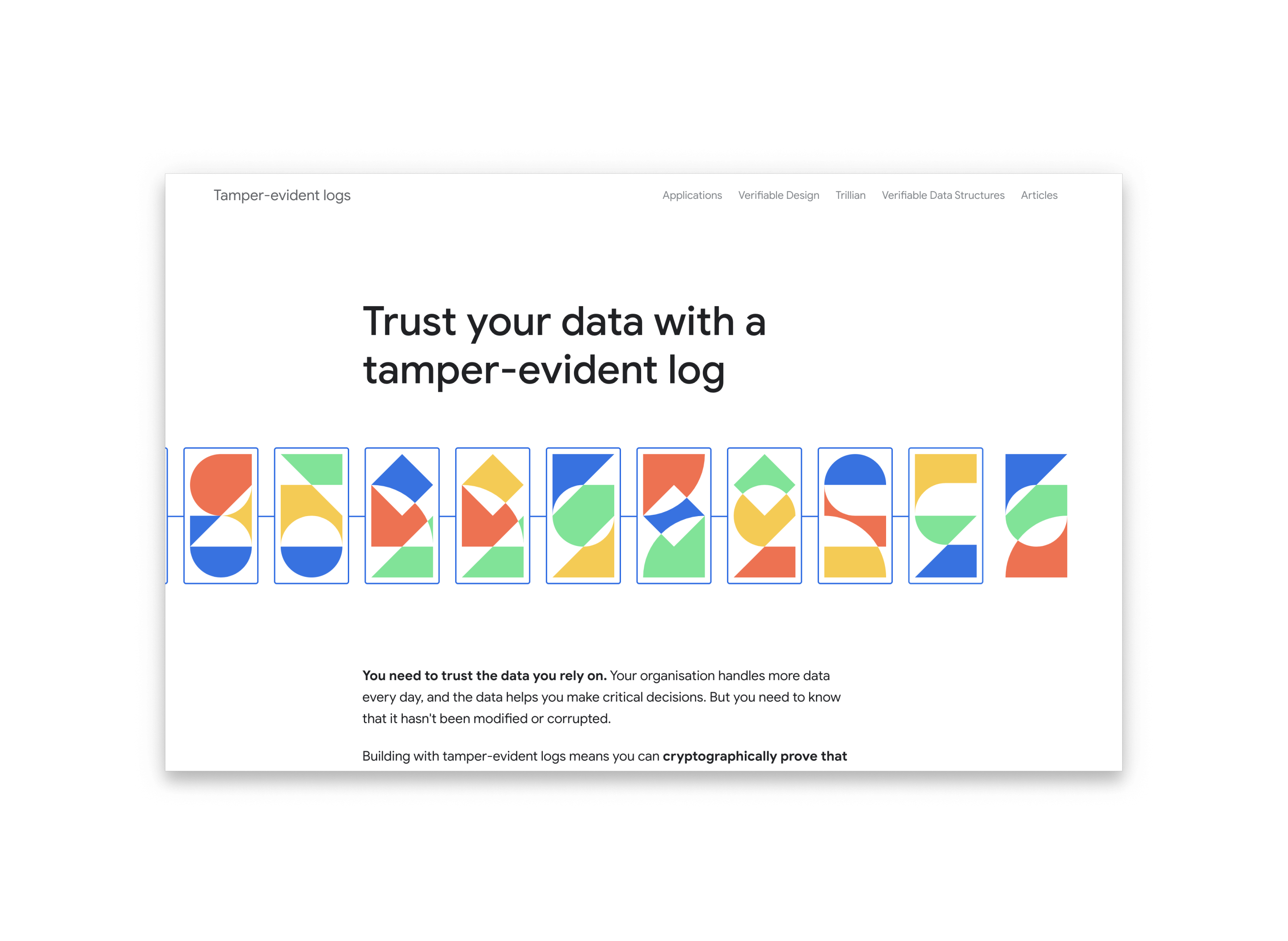A system of shapes and colours, each one unique like the hashes that are part of this technology. Maintained by Google, tamper-evident logs are the backbone of some of the technologies that make the web more secure, like Certificate Transparency.